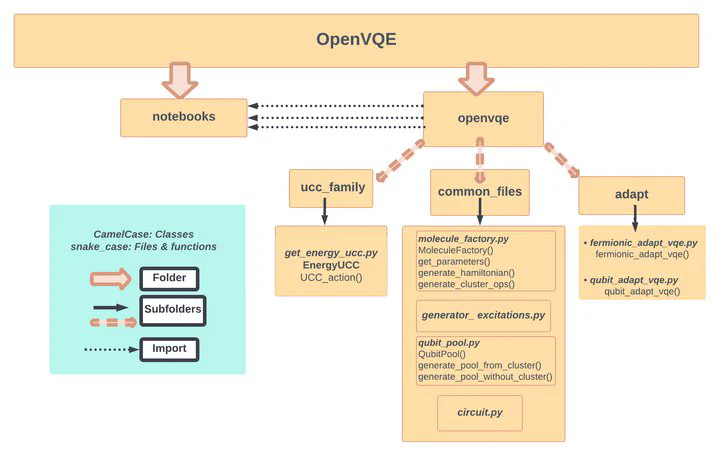 OpenVQE focuses on giving access to modules enabling the use of the unitary coupled cluster (UCC) family of methods and adaptive ansatz algorithms like ADAPT-VQE.