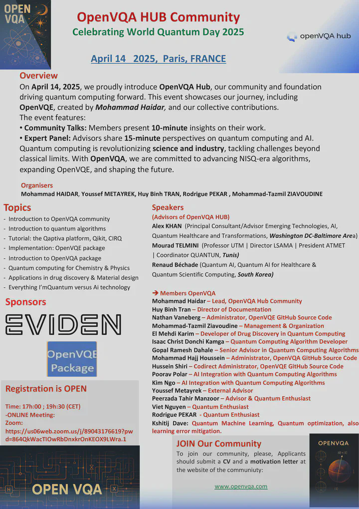 OpenVQA Hub CommunityApr 2, 2025 · 0 min readGo to Project SiteLast updated on Apr 2, 2025 AuthorsMohammad HaidarSenior Quantum Scientist |27k+ followers|🌎 Top Quantum Speaker| PhD & Postdoc @Sorbonne | Mentor Researchers | Creator & maintanir @OpenVQE package |Projects Lead- industry |Quantum Chemistry&Physics|30yr@Paris🇫🇷. Mastering Quantum Chemistry with OpenVQE - A Community-Driven Guide to Quantum Computing Feb 26, 2025 →
